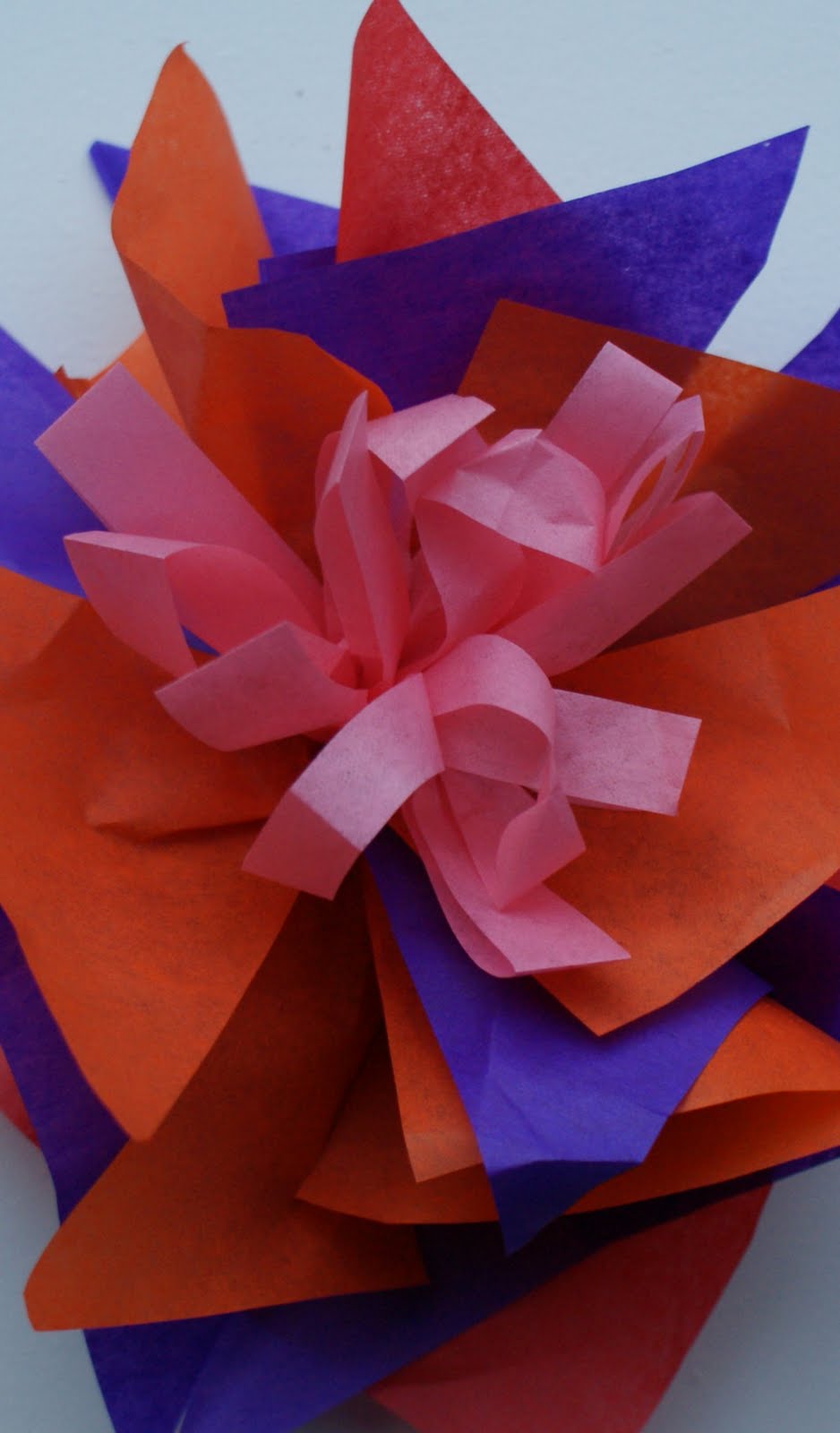 Ik vind het altijd erg leuk om mooie bloemen van zijdevloei-papier te maken voor op de feesthoeden van de jarige peuters. Als ze drie worden, mogen ze er drie uitzoeken, en zoals je al verwacht...als ze vier jaar worden en naar de basisschool gaan versieren we de hoed met vier bloemen. (én gekrulde papierstroken, stickers etc.)
